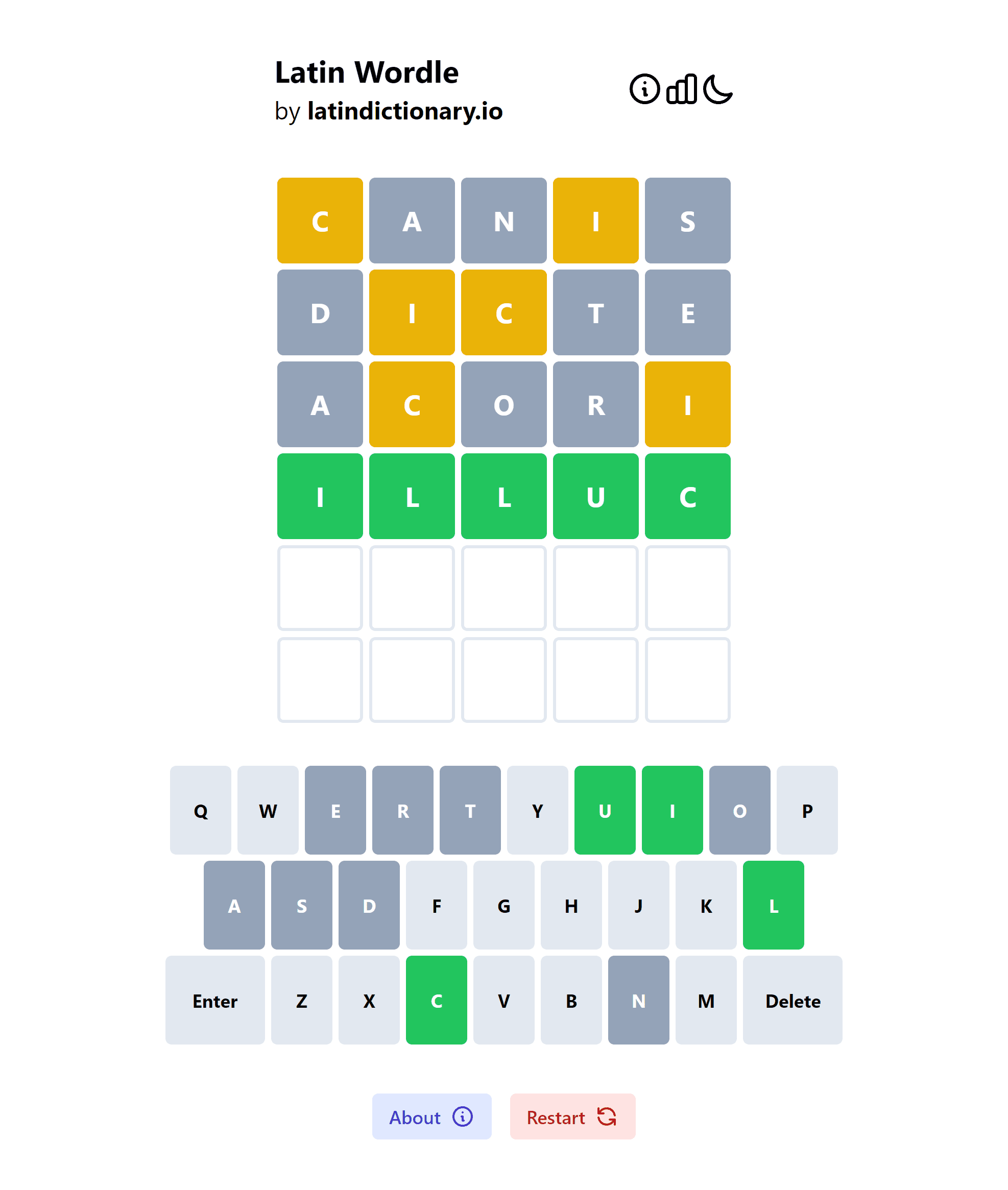 Come back each day to play a new Latin Wordle. Don't forget to share your results with your friends!