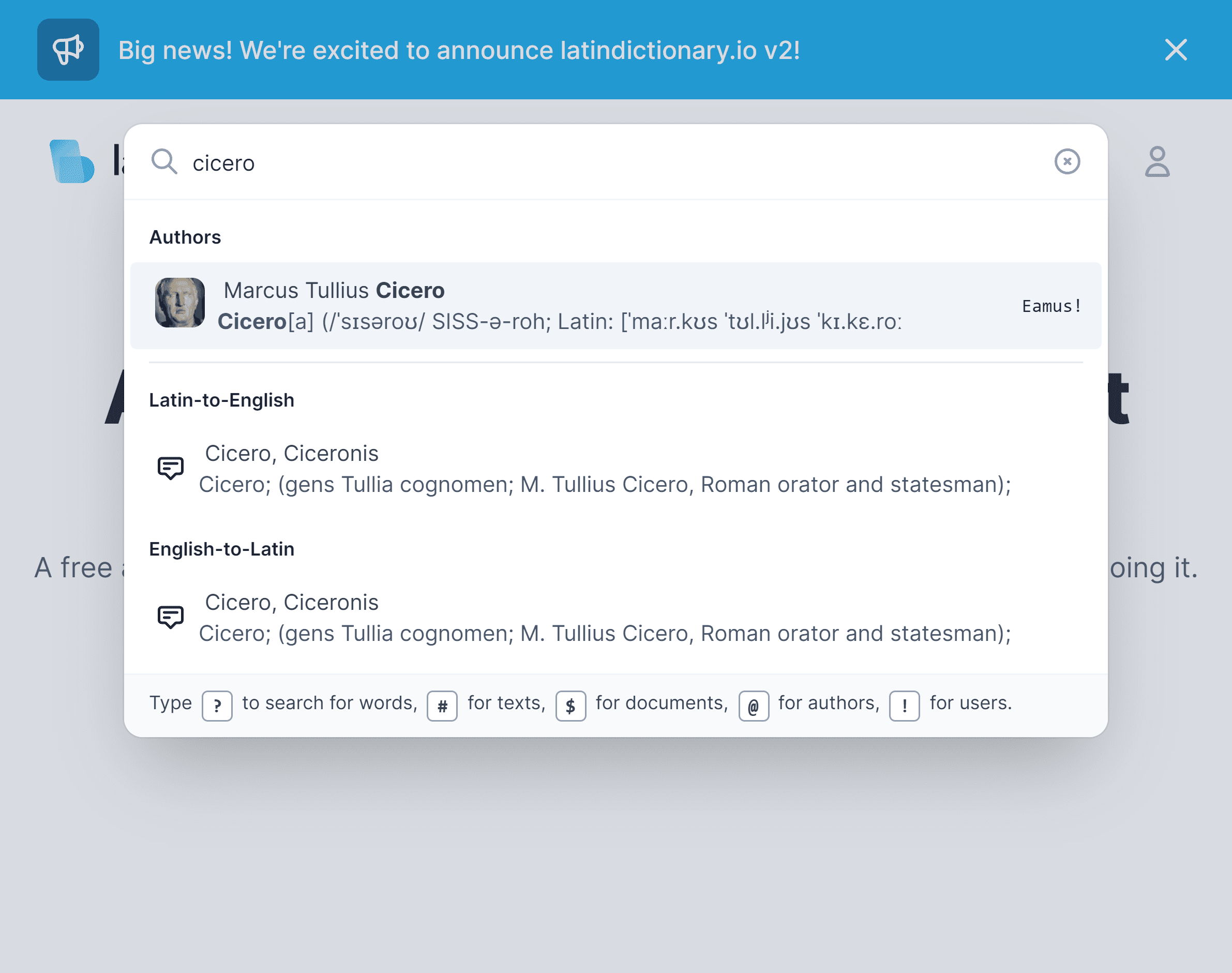 Search for Latin words, English words, texts, authors, word lists, documents, users, and more all in a single place.